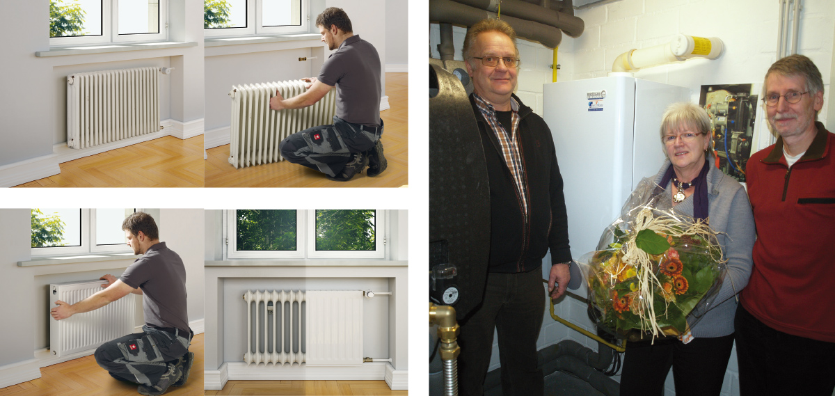 Die Anlage basiert auf einem Gas-Brennwertkessel in Kombination mit einem Stirlingmotor und erzeugt bis zu 5 kW thermische und 1 kW elektrische Leistung. In Ergänzung mit einem Pufferspeicher und Heizkörpern wird das Mikro-KWK zu einem Energiesystem, das für die Bestandssanierung bestens geeignet ist. Außerdem wurden im Zuge der Modernisierung auch die Heizkörper getauscht. Der Austausch der Heizkörper erfolgte einfach und schnell – entleeren, abschrauben, anschrauben, befüllen – fertig. Ohne weitere Aufstemmarbeiten oder Verlegung der Anschlüsse und Rohrleitungen konnten die neuen Heizkörper montiert werden. Da sie passgenau die bestehenden Anschlüsse berücksichtigten, so dass der Austausch der alten Radiatoren kein Problem darstellte.