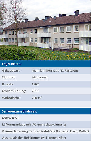 Die Ziegelmauern und der Dachstuhl des in Massivbauweise errichteten Mehrfamilienhauses aus dem Jahre 1962 waren zwar noch in Ordnung aber die Haustechnik war nicht mehr auf einem effizienten Stand. In jeder Wohnung befand sich eine Gastherme im Bad oder in der Küche für die Beheizung und Warmwasserbereitstellung. Auch die Heizkörper stammten noch aus dem Baujahr 1962. Die größte Herausforderung bestand darin, das Gebäude 2011 im bewohnten Zustand zu modernisieren.